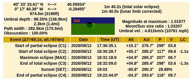 Además, hay que recordar que no es un eclipse largo, por tanto será interesante acercarse tanto como podamos a la linea de centralidad. El mapa interactivo os permitirá saber cuando empieza cada fase, cuanto dura la totalidad y la altura sobre el horizonte.