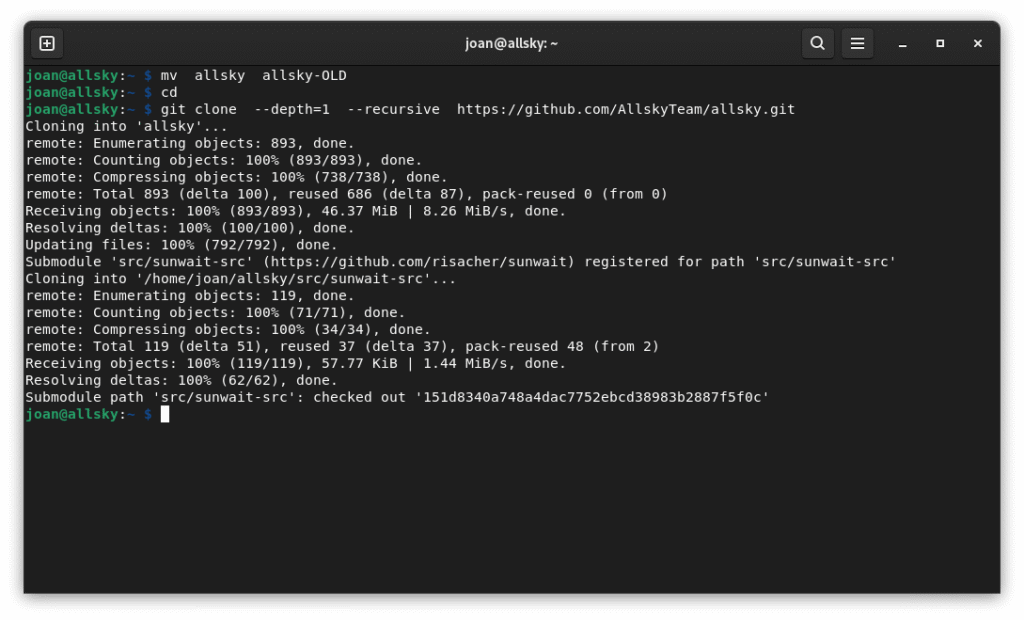 git clone --depth=1 --recursive https://github.com/AllskyTeam/allsky.git