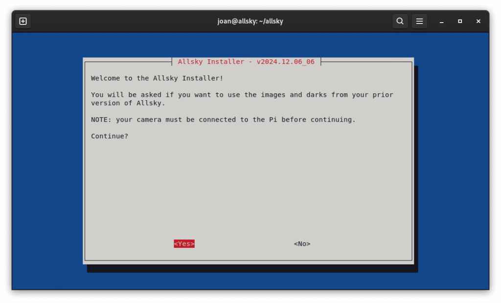 I així veiem la primera pantalla de l’instal·lador d’AllSky: