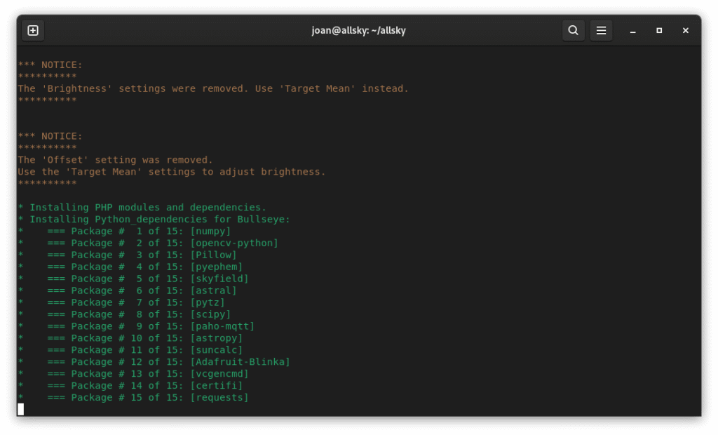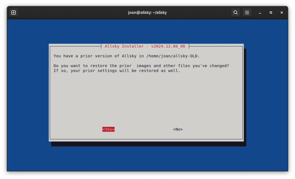 Ací detecta que hem mogut la versió anterior a /home/joan/allsky-OLD i em demana si volem restaurar els fitxers en l’arbre de la nova versió, li direm que sí:
