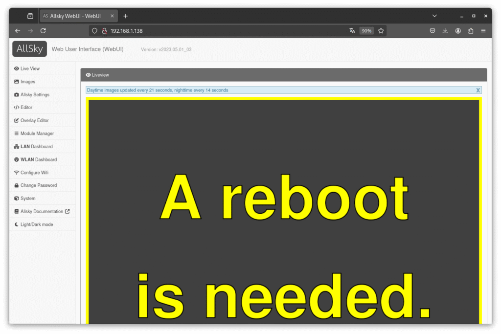 Finalment, la instal·lació està quasi finalitzada. L’assistent informa que podré accedir des de http://allsky.local o des de l’adreça IP de la LAN configurada en la Raspberry Pi i em demana reiniciar: