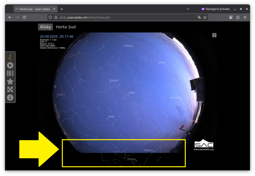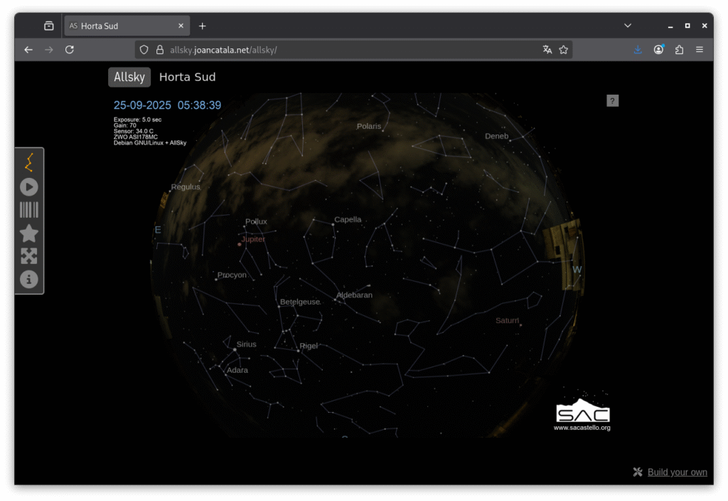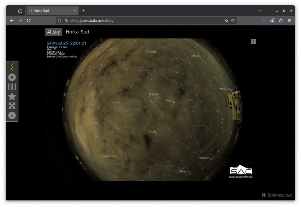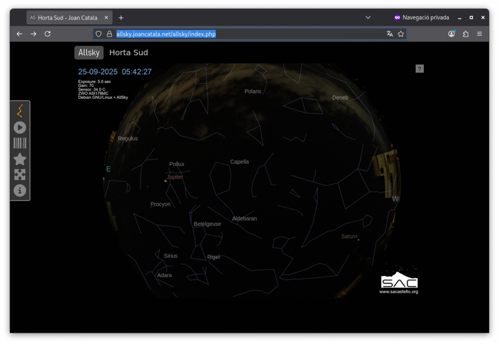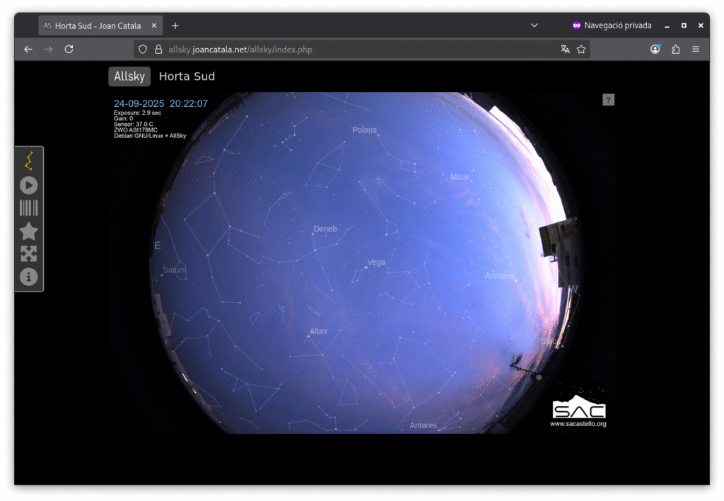 He habilitat l’url: http://allsky.joancatala.net/allsky i ja es mostra la web pública de la càmera Allsky, que he titulat amb el nom «Horta Sud». No anirà molt ràpida, perquè estem navegant sobre la mateixa Raspberry on està la càmera, però crec que és suficient per a veure-la i estar informats.