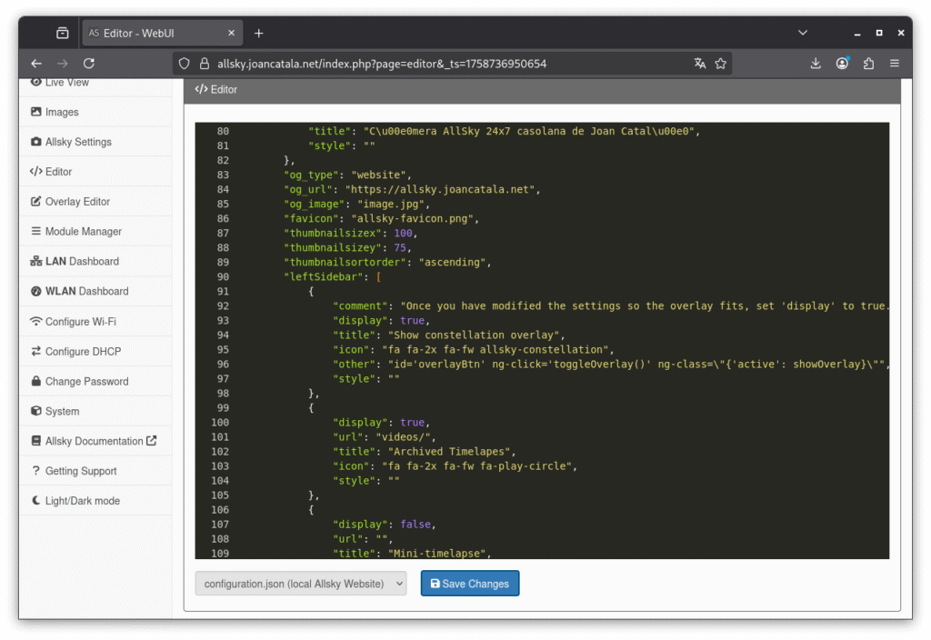 Però jo el que vull és generar una url pública i que Allsky mostre la vista de la càmera per a visitants. Anirem a l’apartat de configuració «Allsky Settings» i en la secció Websites and Remote Server Settings habilitarem l’opció Use Local Website. Açò generarà automàticament un fitxer de configuració. Editarem tots els camps on la variable siga XX_NEED_TO_UPDATE_XX perquè són camps requerits per al bon funcionament de la web com la descripció, el títol de la pàgina, etc.