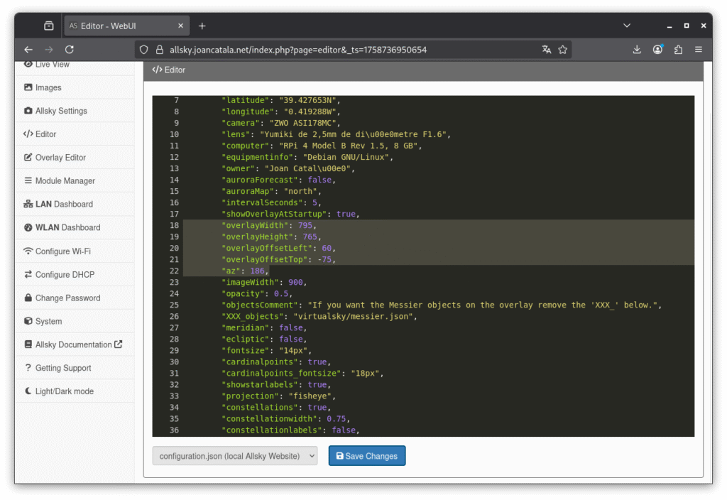 I ara, dos anys després, actualitzaré un poquet el programari i a millorar un poc la utilitat de la càmera. Per un costat vaig a explicar com es fa l’actualització del programari Allsky amb un poc de codi i captures de pantalla, no per a fer-te por sinó per a mostrar-te visualment com es fa aquest procés. I, per altra banda, vaig a afegir algunes novetats a la càmera com una url pública, una capa nova en la visualització i alguna coseta més.
