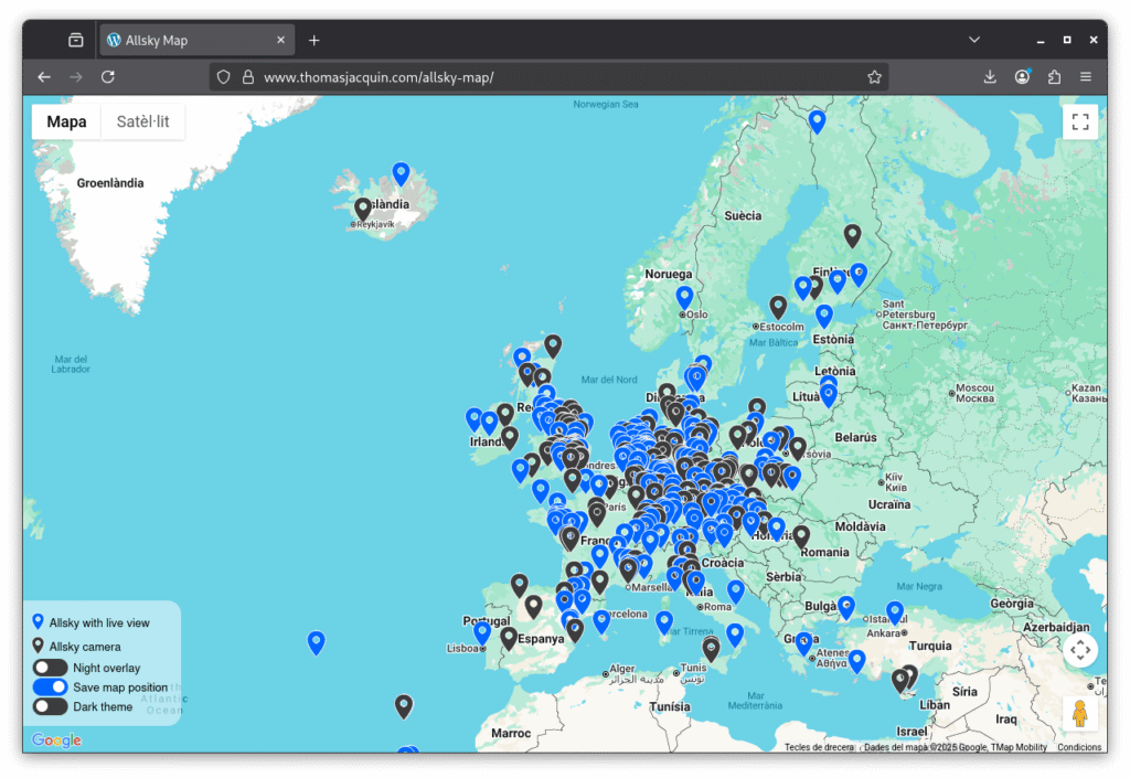 Ací en el mapa mundial, podrem veure totes les càmeres en línia amb aquest programari de Thomas Jacquin: https://www.thomasjacquin.com/allsky-map/, una gran idea que ens permet visitar en temps real altres localitzacions del món.