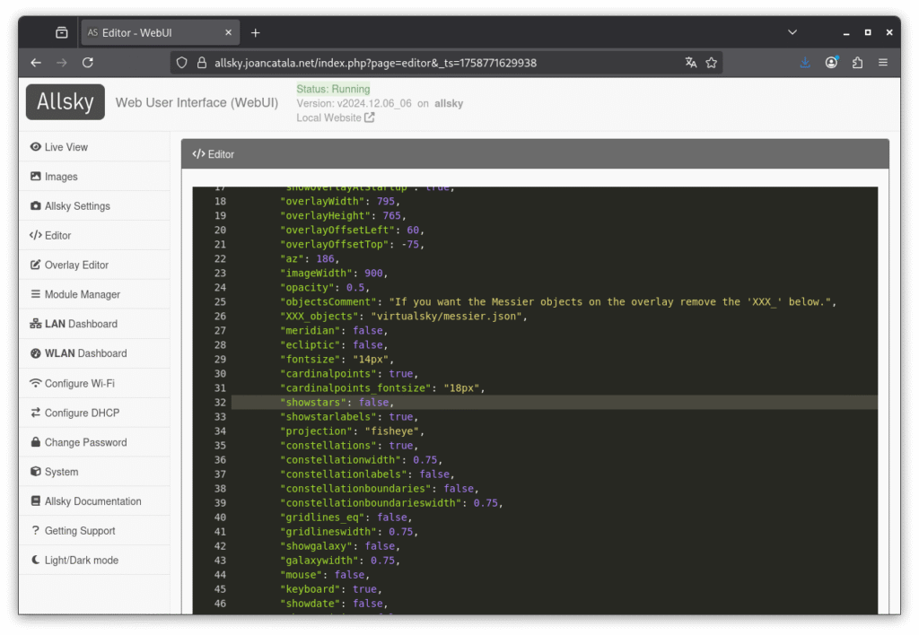 Doncs bé, des de la configuració de Allsky, activarem la capa de VirtualSky fàcilment ficant el valor en true així de fàcil: