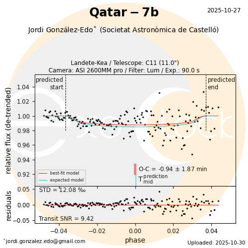 Tránsito de Qatar-7b 2025/12/27 15 de diciembre de 2025 por Jordi Gonzalez Tránsito complejo por la poca profundidad y condiciones del cielo, a pesar de lo cual se consiguió un resultado aceptable. Equipo habitual: C11 f7, ASI2600MMpro. Procesado con HOPS. Remitido y publicado en Exoclock. Veces visto: 2