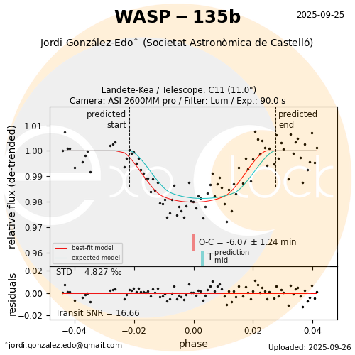 Tránsito del exoplaneta Wasp-135b el pasado 25 deseptiembre de 2025, reportado y publicado en Exoclock, desde el osbervatorio Landete-Kea.